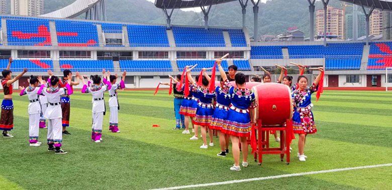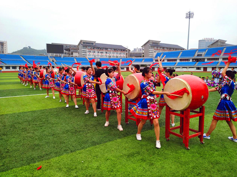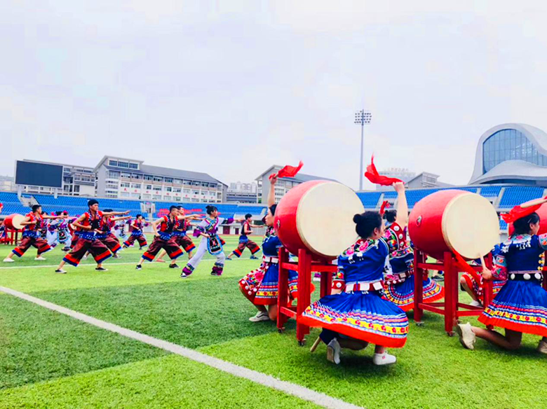 精彩的民族文化表演把活动推向了高潮:由60余名身着苗族服饰的学生和体育组四位老师参加表演的八合鼓武,伴着刚柔相济的音律跳荡,鼓手们于勾拉手、推拉掌、弓马步、腾转身中身走龙蛇,雄浑有力气振山河,尽展苗族人民敢爱敢恨、热情奔放之态。接着,由龙凤社区党支部展演的苗族花鼓作为压轴节目,鼓手们精神抖擞,节奏明快,动作大方,舞姿轻盈,强劲的传统苗族鼓文化气息就迎面而来。田径场上鼓声阵阵,欢声笑语,其乐融融。现场观看表演的师生和群众,感受到了苗鼓的魅力,也对湘西苗族鼓舞文化产生了浓厚的兴趣,大家表示愿意接受并长期坚持学习苗族鼓舞。